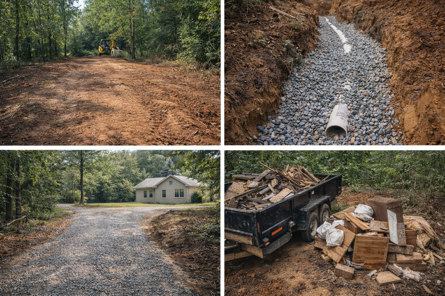 Rough and finish grading services to improve drainage, prepare driveways, and level ground for pads and access areas.